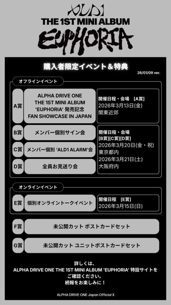 - A賞【ALPHA DRIVE ONE THE 1ST MINI ALBUM ‘EUPHORIA’ 発売記念 FAN SHOWCASE IN JAPAN】